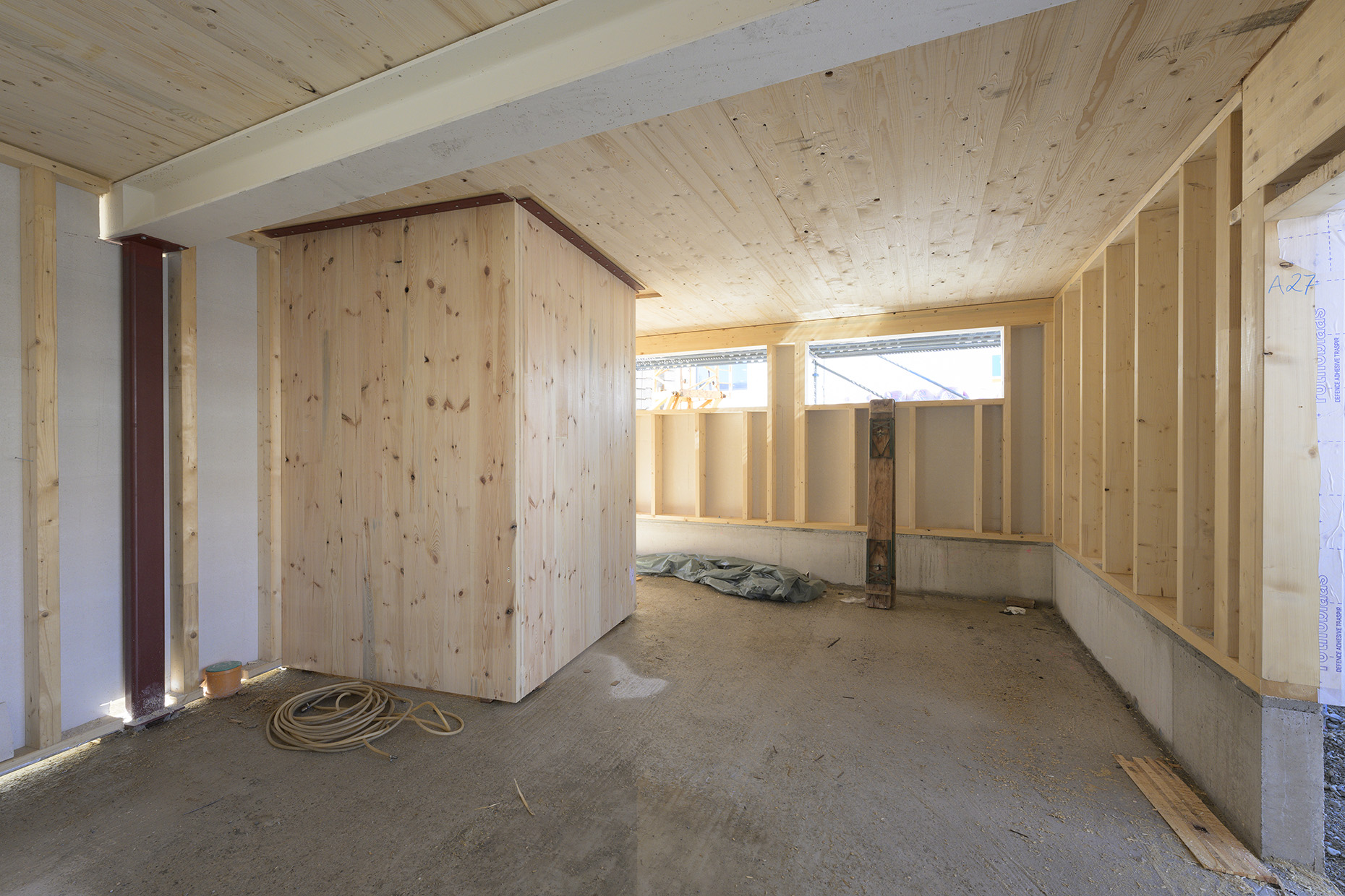 Alle tragenden Bauteile im EG und OG werden als Holzskelett mit Stahlstützen erstellt. Die Holzdecke über dem Erdgeschoss wird als Brettsperrholzdecke und das Dach als Pfettendach mit Blecheindeckung ausgeführt. Die Aussenwände werden als Holztafelwände mit hinterlüfteter, vertikaler Holzschalung ausgeführt. Auf dem flach geneigten Satteldach wird eine PV-Anlage ausgeführt.