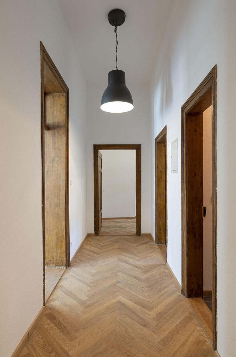 Der durch aufsteigende Kellerfeuchte in Mitleidenschaft gezogene Bodenaufbau wurde bis zum historischen Kellergewölbe durch einen estrichfreien und ökologischen Aufbau ausgetauscht und mit Eichen-Fischgrat belegt. Erhaltende Reste der historischen Fichten-Bodenkonstruktion bekamen, aufbereitet als Fensterbänke und Regalbretter, neue Aufgaben. Die Türen und Türstöcke wurden erhalten und schonend überarbeitet.