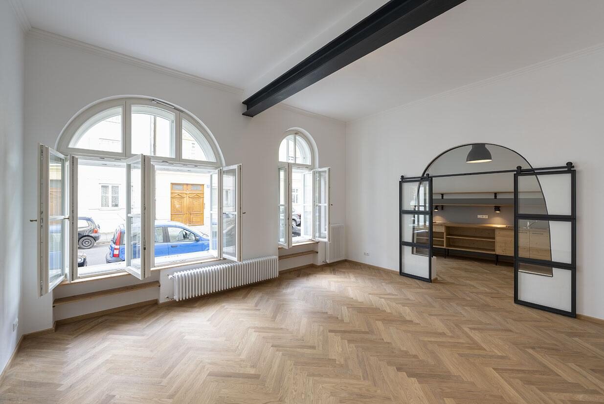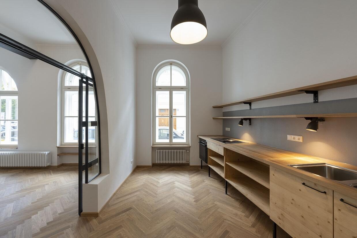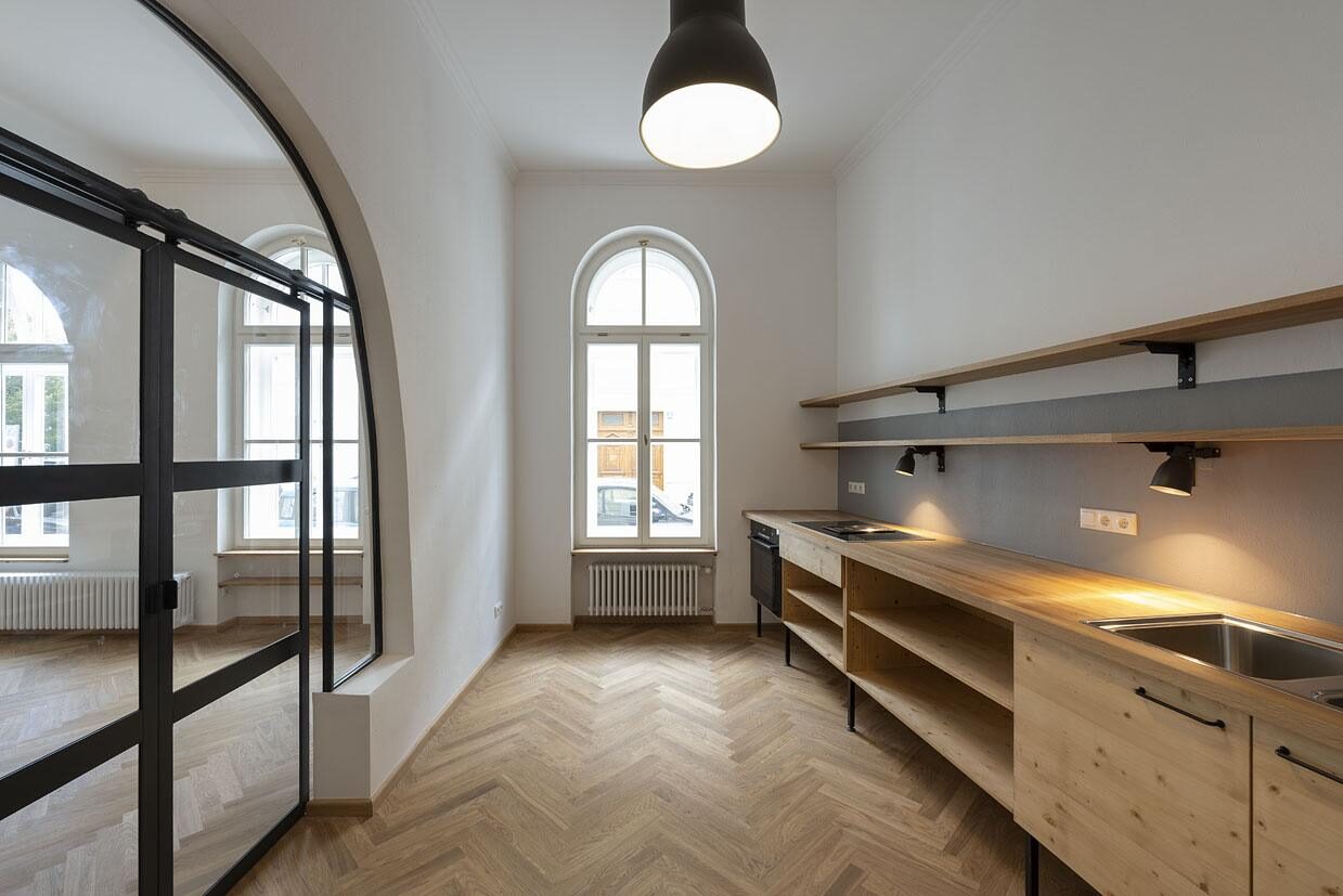 Erst Ladenwohnung, dann Büro, jetzt eine Wohnung mit einer Raumhöhe von 3,60 m: Neben dem respektvollen Umgang mit der Bausubstanz aus dem 19. Jahrhundert, musste die Raumaufteilung neu arrangiert werden; die Teeküche verwandelte sich in ein Badezimmer und eine Küchenzeile kam in einen ehemaligen Büroraum.