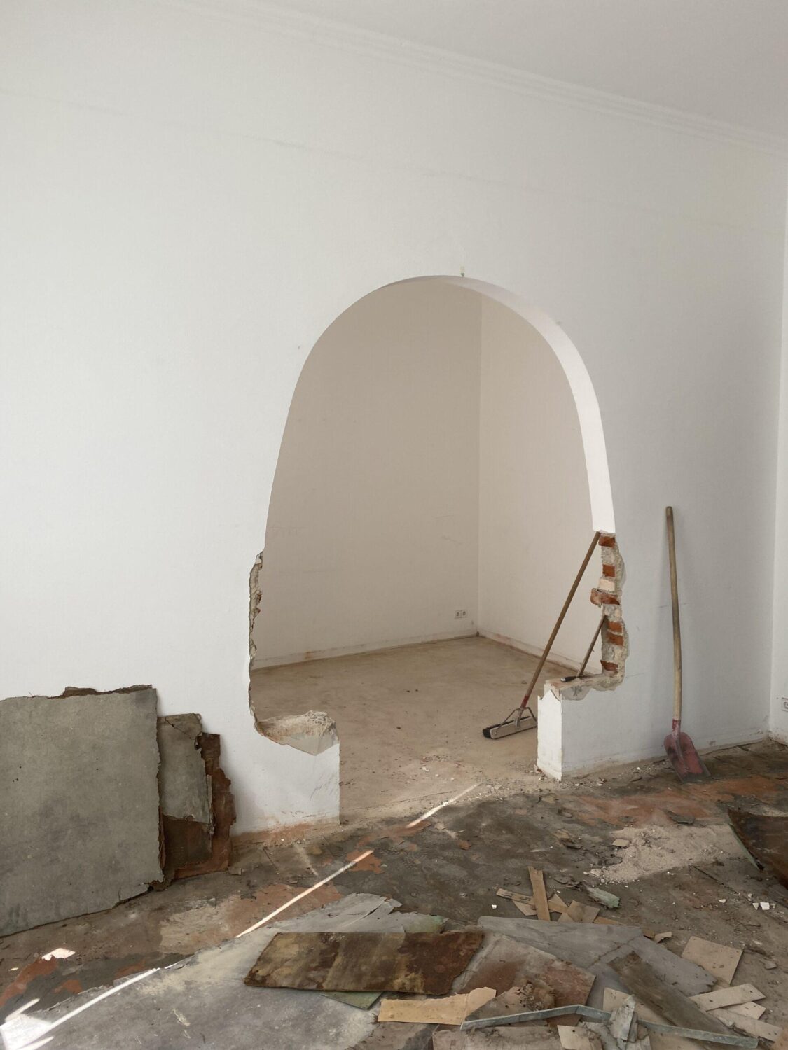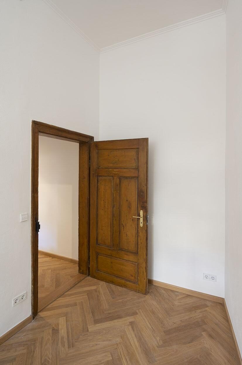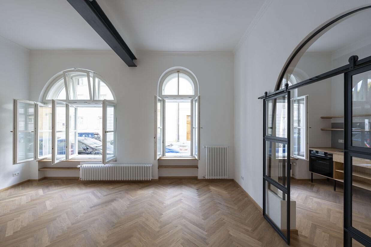 Erst Ladenwohnung, dann Büro, jetzt eine Wohnung mit einer Raumhöhe von 3,60 m: Neben dem respektvollen Umgang mit der Bausubstanz aus dem 19. Jahrhundert, musste die Raumaufteilung neu arrangiert werden; die Teeküche verwandelte sich in ein Badezimmer und eine Küchenzeile kam in einen ehemaligen Büroraum.