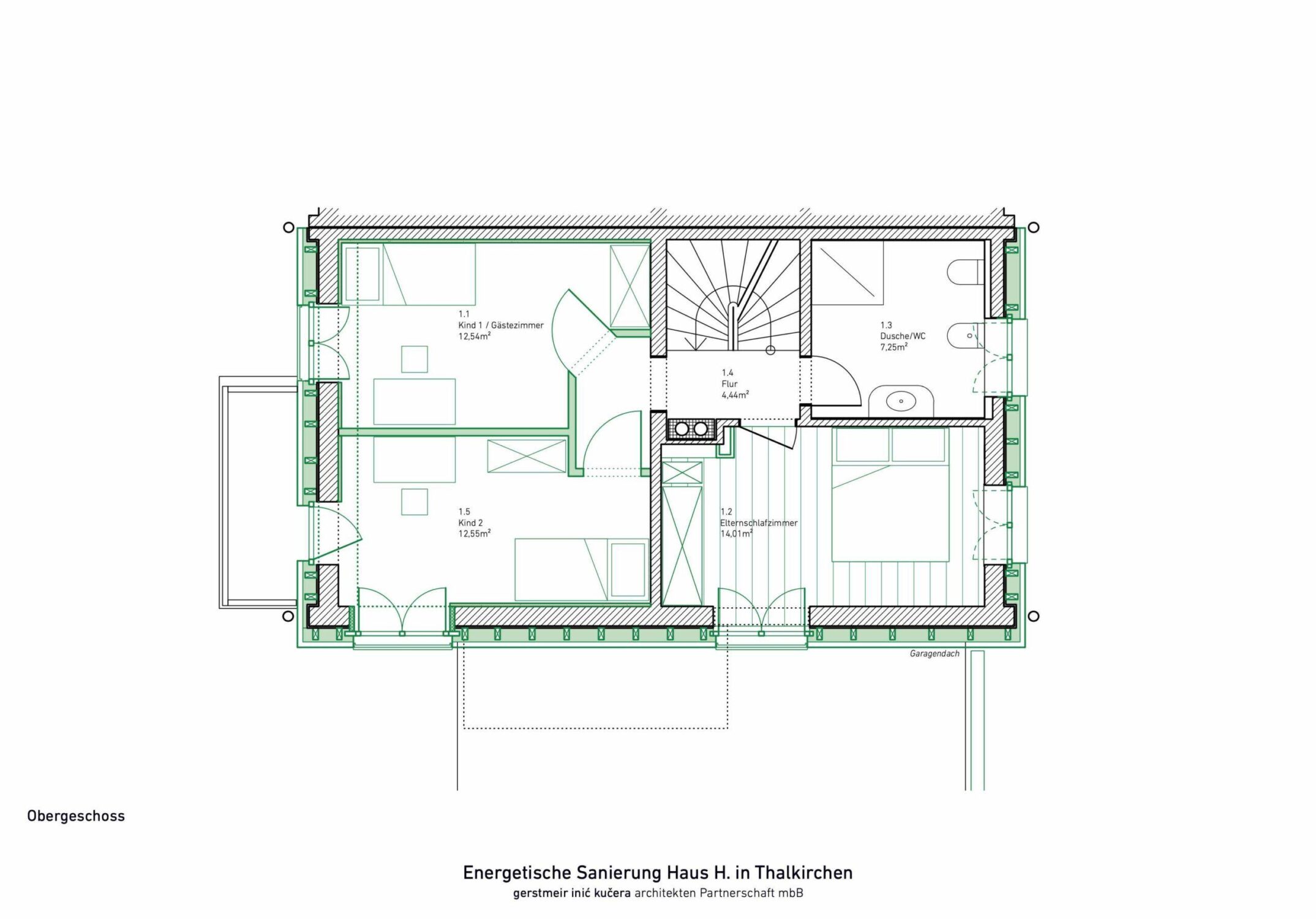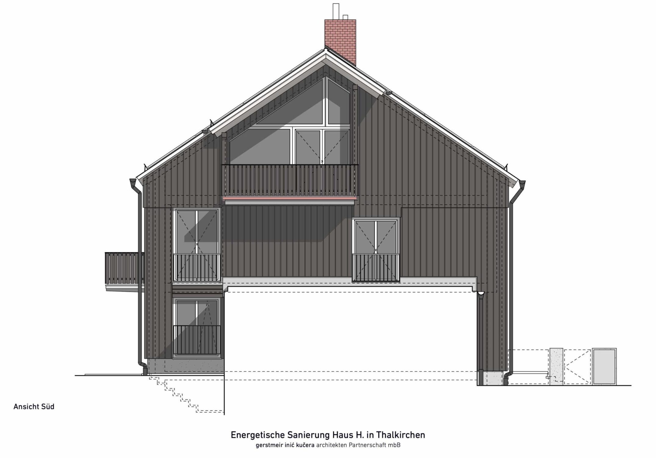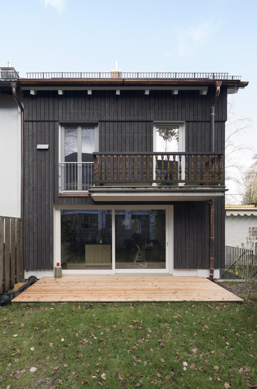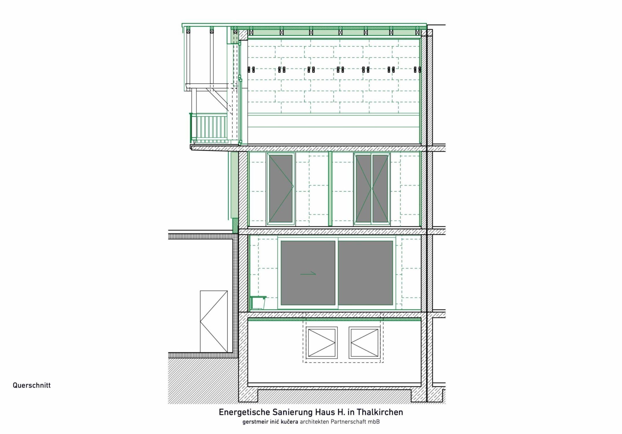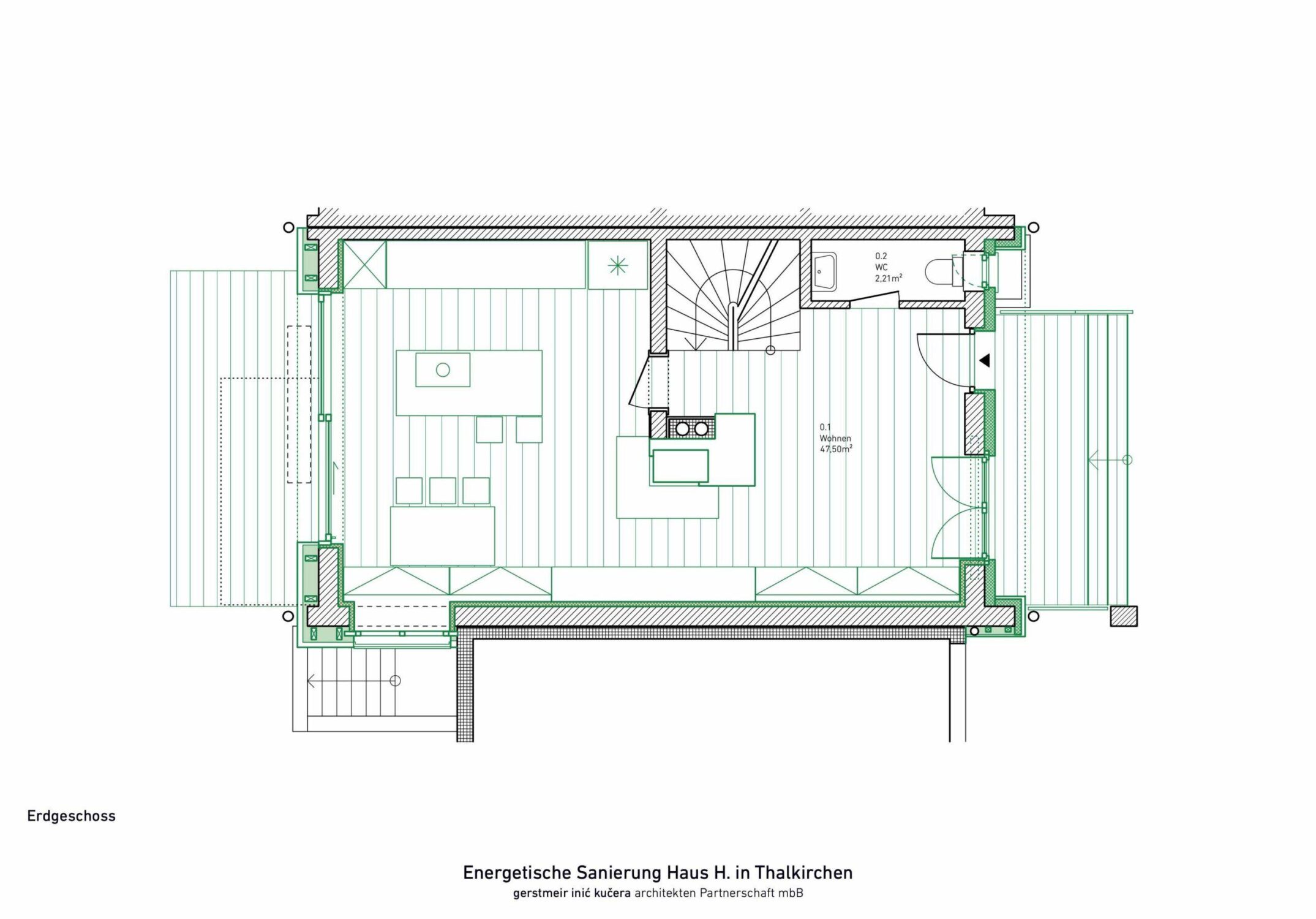 Ein bestehendes Reihenendhaus aus den 1970er Jahren sollte energetisch saniert werden. Das Gebäude wurde vollständig gedämmt und alle bestehenden Fenster ersetzt und vergrößert. Mit dem Einbau einer Wärmepumpe wurden auch die Heizkörper durch neue Flächenheizungen ersetzt. Neben der klassichen Fußbodenheizung wurden an Wand und Dachschräge Lehmbauplatten der Firma Naturbo verbaut. Die Heizregister sind in den Platten bereits integriert und müssen nach Montage nur noch verpresst werden. Mit dem Einbau der Lehmbauplatten haben wir mal etwas neues ausprobiert. Das Haus war ein weiterer Schritt in der bürointernen Entwicklung beim nachhaltigem Bauen.